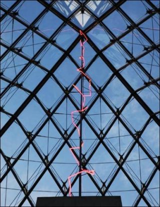 Avec une énergie dense, l’œuvre de Claude Lévêque dialogue avec les lieux qu’elle rencontre pour y activer une forte charge d’évocations et de sensations. Son intervention débute par une mise en incandescence de la pyramide de Ieoh Ming Pei. Liée à la symbolique antique, cette œuvre fait écho aux modules triangulaires des structures tendues et s’inscrit plus largement dans l’architecture alentour et dans la perspective du Carrousel du Louvre jusqu’à l’obélisque puis La Défense.