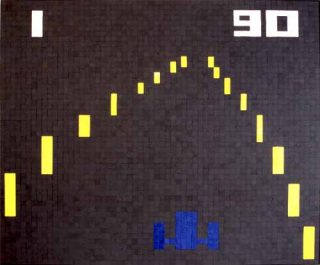 Tes tableaux en mosaï;que, comme Pac Man ou Pong, font la jonction entre ton travail en extérieur et tes préoccupations picturales ? Oui, ces jeux correspondent à une époque où les jeux vidéo étaient très intéressants car les machines n’étaient pas assez performantes pour créer des rendus hyperréalistes (voire même réalistes!). Cela générait donc une esthétique minimale et conceptuelle comme le labyrinthe et les créatures de Pac Man, les lignes colorées du casse brique, les bloc de pixels d’Asteroï;d, ou encore les rangées de Space Invaders…. J’aime cette esthétique, et du fait de leur basse résolution je peux les réaliser en carrelage.