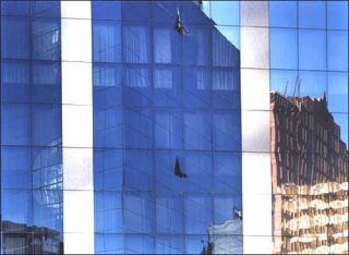 Il s’agit de photographies de bâtiments dont les façades de verre reflètent d’autres architectures et qui se présentent frontalement dans toute leur monumentalité. La mise en abîme créée par cette multiplicité de fenêtres permet de passer progressivement de l’une à l’autre, jusqu à des univers à la fois clos et très ouverts: des ciels dont la diversité de bleus ordonne et compose l’espace.