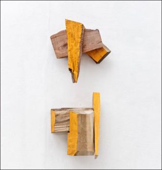 Adossés au mur, des blocs de bois alignés en toute simplicité. Lui font face des œuvres murales composées de plusieurs morceaux de bois de cerisier, cloués les uns aux autres