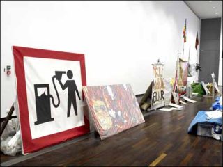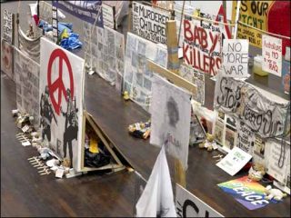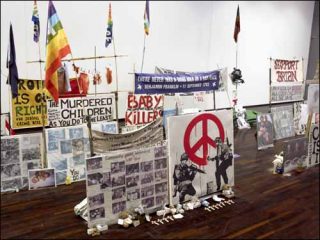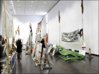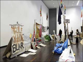 State Britain marque le retour de l’artiste dans le champ du social. La vaste installation présentée actuellement au Mac/Val est une sorte de monument de protestation. Empruntant au réel, l’œuvre reproduit l’«installation», au sens propre du terme, d’un militant pacifiste célèbre outre-Manche, Brian Haw, qui, de 2001 à 2006, a fait le siège du Parlement britannique, le palais de Westminster, pour dénoncer la guerre en Irak et autres horreurs économiques et politiques.