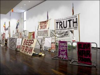 Mark Wallinger a en effet non pas prélevé, mais reproduit méticuleusement chaque banderole et objet (poupées, drapeaux, bougies, etc.) du siège, à la manière d’un monumental ready-made. Transposée dans l’espace muséal, la manifestation de Brian Haw devient monument, œuvre, et restitue à l’institution la capacité de porter le débat sur la place publique, de revenir au cœur de la cité.