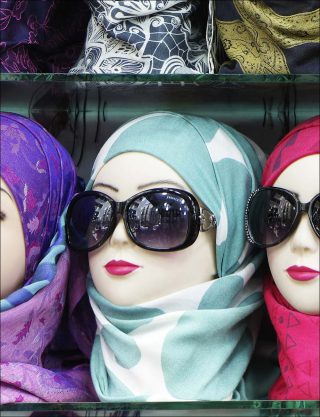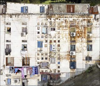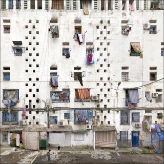Les images se suivent et souvent se ressemblent : larges façades blanches dont l’uniformité est seulement rompue par la variété des fenêtres, grilles et rideaux qui garnissent leurs ouvertures. Dans ses étendues verticales de béton, la matière textile, mouvante, irrégulière, colorée, sème des preuves de vie. A la linéarité des murs s’opposent les courbes des rideaux multicolores flottant au vent, la riante pagaille du linge accroché aux balustrades ou sur des fils reliant une fenêtre à une autre.