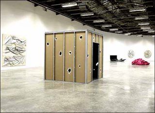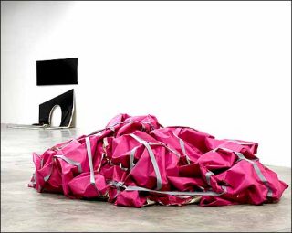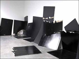 On ne peut s’empêcher de voir au travers de toutes ces oeuvres des références à l’histoire de la peinture moderne et post moderne. Malevitch et son Carré rouge de 1915, Pollock, Burren ou encore Mosset, sont-ils des inconnus pour Steven Parrino? Et qu’en est-il du caisson en panneaux de plâtre qui trône dans la pièce? Trashed Black Box II, parallélépipède violemment troué de part et d’autre, n’est-il pas le vestige délabré d’une effigie minimaliste?