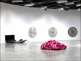 La matérialité des pliures joue avec la lumière, tout comme dans les trois tondos, Cyclotron, Caustic Pill et Skeletal Implosion. Ce qui semblait jusqu’ici fixe et pétrifié côtoie l’insaisissable. Des vibrations fugitives naissent dans les creux et les bosses que l’on découvre au fil de nos déplacements. Les rayures noires ou argentées se froissent. Le contour circulaire qui arbore des tâches et des giclûres dialogue avec ces tracés géométriques et rectilignes devenus obsolètes.