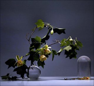 Chez Stéphane Spach, la nature morte condense la restitution d’une ambiance intérieure et l’expression de la fragilité de la nature. Dans la photographie intitulée Tulipier, un vase en verre supportant un bouquet de fleurs et de branches feuillues jouxte une cloche sous laquelle sont réunies quelques feuilles mortes, tandis que quelques autres sont dispersées négligemment autour. Plongée dans l’obscurité, la scène semble capter des signes ténus, les traces silencieuses d’un monde mystérieux.