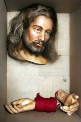 Le point d’orgue de ces séries est une nouvelle fresque photographique réinterprétant la Cène de Leonard de Vinci. Mises en scènes dans des cartons, les têtes coupées, flottantes, de Jésus, Marie et des apôtres, accompagnées de mains sectionnées mais expressives, recomposent précisément le chef-d’œuvre dans sa version contemporaine. Les fragments de mannequins offrent une vision brute de la piété, en résonnance étrange avec l’iconographie chrétienne du martyre.