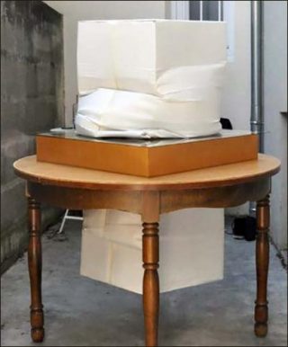 Guillaume Jezy et Jérémy Knez intègrent les deux cartons à une sculpture en forme de table intitulée Forum 1: l’un est fixé au-dessous du plateau, l’autre posé dessus. Entre les deux cartons est posée sur la table une plaque de verre qui agit à la fois comme un présentoir qui met en valeur le contenu hypothétique du carton et comme une vitre transparente ouverte sur un microcosme intérieur. Les deux cartons sont compressés comme s’ils contenaient une masse d’air en train de s’épuiser. Le temps semble compté dans l’espace scellé des deux cartons, où se joue une fiction à inventer.