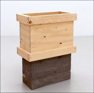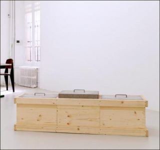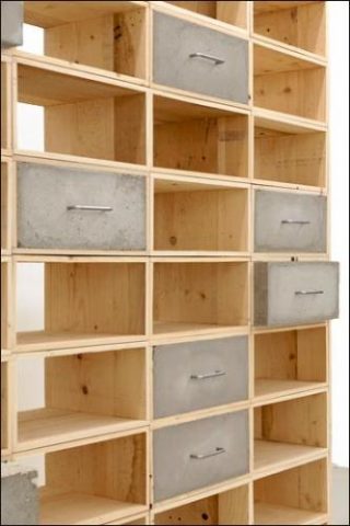 L’ensemble de pièces produites à l’occasion de sa première exposition solo à la galerie Jousse Entreprise est composé de modules identiques, casiers en bois assemblés selon différents agencements évoquant du mobilier de rangement. Certains d’entre eux sont occupés par des tiroirs en béton dont des répliques sont également disposées au sol, comme si elles venaient d’être retirées ou étaient en passe d’être remisées. Aussi absurde que burlesque, leur usage se révèle bien peu commode: leur capacité de stockage est nulle et leur ergonomie, à première vue étudiée pour en faciliter le transport, se retrouve lestée par le poids d’un matériau qui les rend péniblement déplaçables. Second constat: leur moulage a directement été effectué dans les boxs leur faisant office de réceptacles, comme en témoignent les empreintes laissées par les nervures du bois.