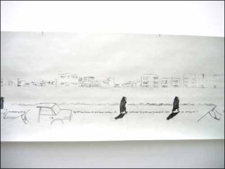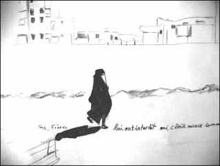 L’œuvre qui caractérise le mieux cette idée est sans nul doute la longue frise de Maya Schweizer. Une femme voilée pense en marchant le long d’une route bordée d’un océan d’immeubles. Sa pensée défile en bas de l’image, sous la forme d’un sous-titrage. La forme elle-même du dessin, juxtaposant différents instants les uns à la suite des autres, rappelle la forme d’un story-board de cinéma et celle des frises médiévales qui présentaient dans le même plan la même scène à des moments différents.