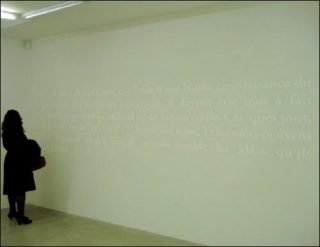 En contrepoint, dans la Box des moulins au centre d’art Le Lait, une phrase et une chambre noire transformée en sténopé invitent le visiteur à prendre le temps de découvrir l’image et le propos uniques choisis par l’artiste. L’aveuglement provoqué par cette chambre noire induit cette fois-ci persévérance, recherche, attente et frustration, qui sont les voies incontournables d’un accès à la connaissance. L’image se dévoile difficilement et le spectateur est invité à profiter de ce temps d’apparition pour décoder l’image, la déchiffrer et la penser en regard du contexte de l’exposition.