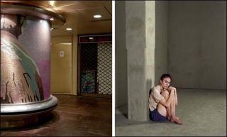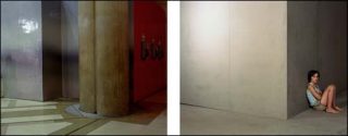 Quelques comparses plus vrais que nature se détachent des décors déprimés reprenant la structure de ces architectures intérieures dans le studio de la photographe. Ni flâneurs, ni dandys, ni prostituées. Un jeune Asiatique allongé au sol, la tête calée contre un mur en ciment. Une fillette brune assise, adossée à une paroi, regard caméra. Une jeune femme debout, bras croisés, vêtue d’une minijupe dorée, fixant le spectateur.