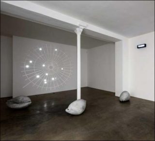 La réflexion sur la science et ses instruments de mesure se poursuit dans Transvariation, dont la surface plane représente une carte de l’Arctique où se situent une douzaine de stations de recherche internationales. Des sphères lumineuses, plus ou moins intenses, traduisent les premiers relevés de températures effectuées dans ces stations à la fin du XIXème siècle. Les données passées servent alors de point de référence pour évaluer les variations de température que l’on observe aujourd’hui, et qui dénotent un réchauffement climatique. Les sphères lumineuses apparaissent alors comme des boules de cristal à travers lesquelles nous pourrions entrevoir l’avenir. Melik Ohanian convertit ainsi des données scientifiques en signaux lumineux, tout en interrogeant cette volonté de quadriller, quantifier et penser notre rapport au monde. Toutefois, l’artiste rappelle que la dimension scientifique d’un tel projet est avant tout portée par une volonté humaine d’explorer le globe et de voyager dans les contrées les plus hostiles, témoignant en cela d’une dimension existentielle plus profonde encore.