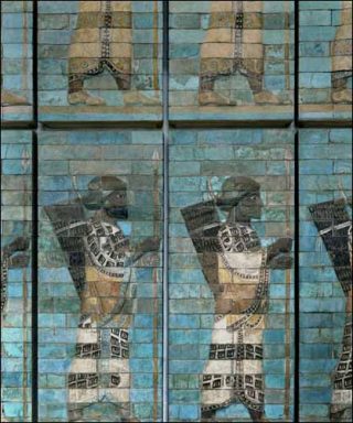 Une vingtaine d’épreuves de grands formats, accrochées sur les murs bruts de la salle de la maquette, et disposées en frise, représentent des détails de bas-reliefs assyriens et perse achéménide — appartenant respectivement aux palais de Khorsabad (fin du VIIIe siècle av. J.-C.) et de Suse (Ve-IVe siècle av. J.-C.) —ainsi que des détails de statues akkadienne et néo-sumérienne, conservés au Louvre, au département des Antiquités orientales.