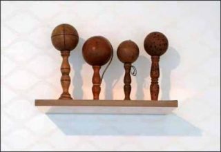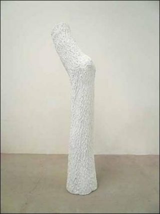 D’autres interventions, plus discrètes et plus secrètes attestent de l’empressement des artistes à aborder la question du désir. Raphaël Zarka le fait par des voies détournées. Trois bilboquets posés sur une étagère, référence à peine voilée à la filiation « magnétisme de la terre » et « magnétisme des corps » (Ptolémaïques 2). Didier Fiuza Faustino prolonge cette confusion des sens à travers l’installation de deux pièces. Heaven, (littéralement « paradis ») une planche de bois sur laquelle peut se lire l’inscription éponyme, celle-ci se détachant de la surface uniquement grâce aux ombres et aux reliefs laissés par les fissures des lettres. Et Naked Lunch, un objet en porcelaine hésitant entre le sextoy et la déco, cette double interprétation générant justement tout le trouble. Didier Marcel se sert d’un arbre déraciné, recouvert d’une poudre artificielle et de son tatouage de coupe pour évoquer la question de l’appartenance « à la vie à la mort », ressource quasi-mystique qui permet au couple de tenir (Sans titre).