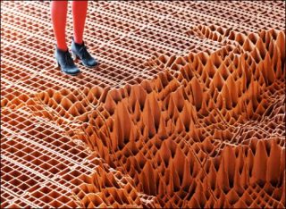 A l’inverse de la proposition qu’il avait faite à la Chapelle des Calvairiennes de Mayenne en 2005, Vincent Mauger choisit d’accentuer la trame alvéolée en travaillant des reliefs creux. Il met en place autant de précipices sous nos pas qui décuple la sensation de risque. Le jeu est là , dans la conscience lucide d’une sorte de panique voluptueuse. L’œuvre ne se réalise vraiment que dans le spasme, la transe ou l’étourdissement «qui anéantit la réalité avec une souveraine brusquerie».