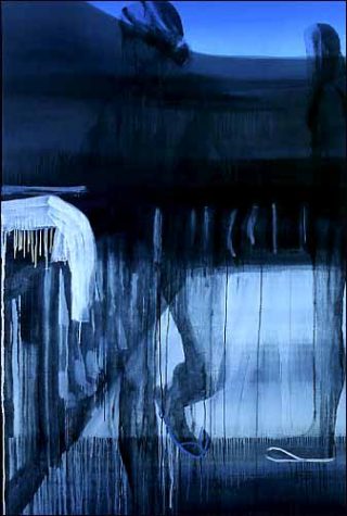 A la manière des tableaux de Friedrich, cette figure féminine sert de relais entre notre propre regard et le fond du tableau. Un jeu de transparences provoqué par la dilution extrême des couleurs fait se confondre les plans, rendant le paysage visible à travers le corps de la femme. L’artiste nous livre par ce procédé une vision synchrétique, comme rêvée de la scène où les notions de proximité et d’éloignement sont abolies.