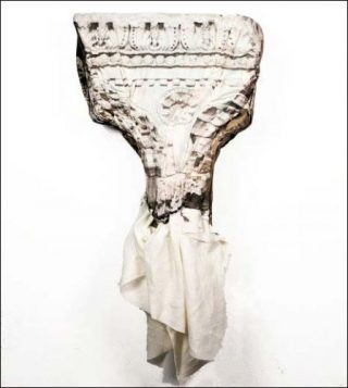 Au bout d’un corridor, sous une verrière, les contours d’un bénitier disparaissent dans un puits de lumière. D’autres se détachent de l’ombre. Suspendues aux murs immaculés ou posées au sol, une dizaine de statues enveloppées d’un linceul revêtent les silhouettes de fragments architecturaux : saints, colonnes, vasques filent le parcours du spectateur. En filigrane, la procession d’un fidèle, depuis la nef jusqu’au chœur d’une église, s’impose. Un silence funèbre se répand. Clément Valla sublime l’espace d’exposition en sanctuaire : ci-gisent les reliques des monuments religieux détruits à la Révolution, démantelés puis disséminés outre-Atlantique.