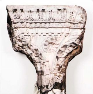 Or, un malaise croît à mesure que le regard s’accroche à ces objets-fantômes : les draps de lin ne portent pas les stigmates du temps, nulle trace de dégradation organique dans les empreintes qui s’y dessinent, des pixels blancs remplacent les éclats sur les faces burinées de Saint-Firmin ou de Saint-Pierre. «Surface Proxy» présente des modèles «remédiés» de pièces détachées d’abbayes — de Cluny pour la plupart — sélectionnées dans les musées de New York et Providence. Purs produits numériques, ces répliques résultent de différents procédés de modélisation: reproductions des surfaces obtenues grâce à l’application 123d catch, texture drapée et couleurs rendues par le logiciel Blender puis imprimées sur des toiles de lin. L’artiste épingle enfin les tissus à motifs trompe-l’œil sur des prototypes fabriqués par impression 3D. Les voiles dissimulent l’imposture comme ils révèlent la présence matérielle de ces objets de substitution.