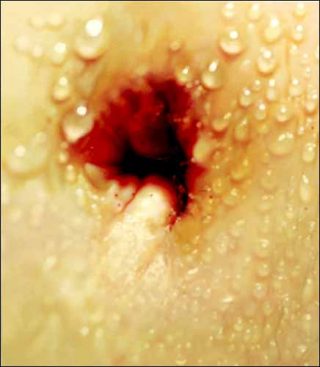 Si Marilyn Minter récuse la parenté de ses peintures avec celles des maîtres hyperréalistes Gerhard Richter et Chuck Close, à cause des gros plans qui les rapprochent de l’abstraction, Belly et Freckles sont suffisamment réalistes pour nous tenir à distance. La première représente un nombril étrangement rouge et la seconde, une épaule couverte de taches de rousseur habillée d’une bretelle rose, les deux en sueur, toujours.