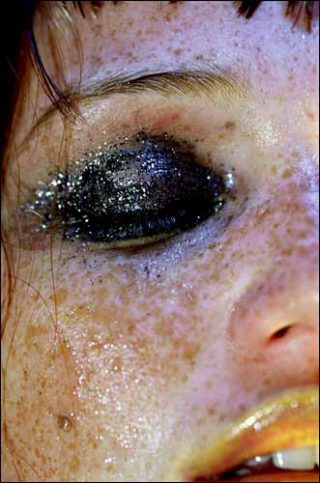 Glamour également, la photographie Shinola montre la moitié d’un visage de femme très maquillé de noir et de jaune, l’œil fermé et la bouche entr’ouverte. Cette pose lascive répond à celle de Pamela Anderson dans la photographie Pink Bra. L’artiste ayant recours cette fois au flou, les reflets de la lumière sur sa peau mouillée deviennent nébuleux. Les bulles flottantes finissent de nimber la photographie d’une atmosphère ouatée.