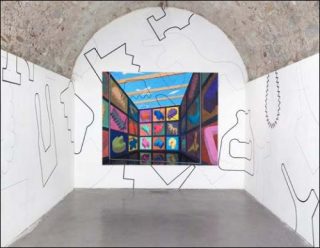 Dans la dernière salle qui a conservé le Dessin mural n°4 d’Alain Doret, les motifs noir et blanc en suspens accueillent des tableaux de paysages. Ils peuvent évoquer un monde rétro-futuriste (Franck Eon), des ruines à l’envers (Simon Bergala), des vues d’exposition (Alain Doret), ou encore des paysages pseudo-exotiques-naïfs (Douanier Rousseau), si cette catégorie est opérante. Ils nous plongent en tout cas dans un espace-temps souvent paradoxal, un futur tel qu’on le voyait auparavant, dans le passé, dans un monde où la peinture peut fabriquer des oxymores visuels crédibles et illusionnistes à la fois.
