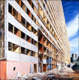 L’exposition est une déambulation dans une suite d’ambiances contrastées que suggèrent les associations de tableaux. Après avoir franchi le faisceau lumineux de la vidéo projection d’André Raffray, et donc avoir momentanément fait partie de l’œuvre, on pénètre dans une première salle de paysages: un grand format «publicitaire» pour un immeuble disparu d’Yves Bélorgey fait face à une vue d’une ville idéale de Simon Bergala, à la fois cristalline, sécuritaire et en travaux. Un tableau de Werner Büttner montre le soubassement d’un immeuble de la banlieue d’Iéna, où est né l’artiste.