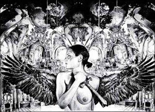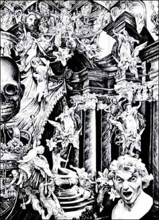 Le talent de dessinateur de l’artiste et sa fascination pour le baroque apparaissent dans le dessin Bernini Opera in Three Parts Simultaneously, où l’on reconnaît diverses œuvres du célèbre sculpteur italien du XVIIe siècle, dont une tête de faune hurlante d’angoisse. Dans Lux Eternus (Eternal Light), c’est la splendeur passée de Versailles que fait surgir l’artiste, auteur récemment de la série sadienne Royally Fucked !, mettant en scène dans des décors du même type des orgies très réalistes.