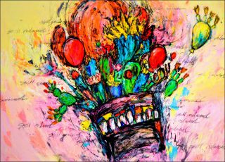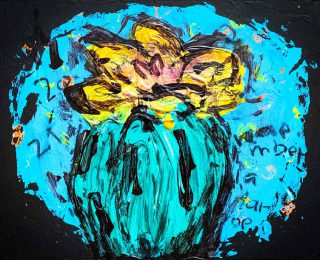 Sur ses Å“uvres, on déchiffre des messages inquiétants ou optimistes, « Still connected », « Still standing », sous un personnage noir, masqué mais souriant, réplique de style comics d’un Dark Vador enfantin, au nez rouge vif. On y retrouve, comme une petite mélodie, des tournesols, des cactus, un planisphère, tous indices d’une indestructible résilience.