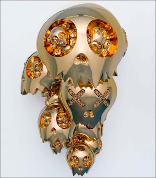 On retrouve en effet à travers toutes les œuvres des réminiscences de personnages et motifs qui forment la signature de Takashi Murakami depuis vingt ans. Les crânes en particulier, figures de l’impermanence de la vie humaine, sont présents sous de multiples formes. La sculpture intitulée Dragon Heads – Gold est un assemblage de crânes de tailles variées réalisés en fibre de carbone et de verre recouvertes de feuille d’or. Parfois éléments à part entière de la composition, ils deviennent ailleurs une simple toile de fond, comme dans la série Monochrome. Les personnages hauts en couleur, monstrueux ou attachants, qui peuplent le monde de l’artiste se retrouvent dans ses nouvelles œuvres, toujours à la croisée des cultures manga et des mythologies anciennes.