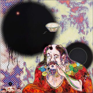 Un ensemble d’œuvres exploite la tradition des peintures d’arhats. Les arhats est le nom donné aux cinq cents disciples de Bouddha qui ont réussit à atteindre l’illumination par le dépassement de la cupidité, de la haine et des illusions. Ils ont fait l’objet d’un culte au Japon du 17e au 19e siècles, à travers des peintures et des sculptures. Takashi Murakami, fidèle à son habitude de relecture de l’art traditionnel japonais par le biais de techniques actuelles, s’approprie cet héritage pictural. Une série de cent peintures réalisées par Kanō Kazunobu après le tremblement de terre survenu à Edo Ansei en 1855 a particulièrement inspiré Takashi Murakami. L’œuvre The 500 Arhats a été peinte en écho à celle de Kanō Kazunobu, à la suite du séisme et du tsunami qui ont frappé le Japon en 2011. Ce tableau de cent mètres de long, présentée en 2012 dans le cadre de la rétrospective de Takashi Murakami au Qatar trouve un prolongement dans les œuvres exposées galerie Perrotin. Des extraits de cette peinture monumentale sont isolés et développés tandis qu’une sculpture représente l’artiste lui-même sous les traits d’un robot arhat.
