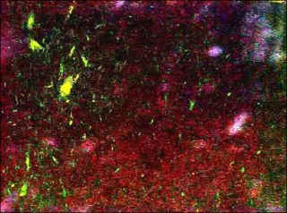 Dans une autre projection, des taches de couleurs s’excitent sur un fond noir, comme des insectes volants dans la nuit.