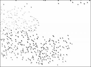 Deux projections consacrées à la danse de minuscules oiseaux s’entrecroisent. Les aller retour se suivent et se ressemblent, il semble que le groupe escorte son chef vers une destination inconnue.