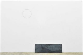 Deux sculptures d’acier disposées au sol viennent rompre la sérialité de l’accrochage, tout en faisant le lien avec le travail de dessin.