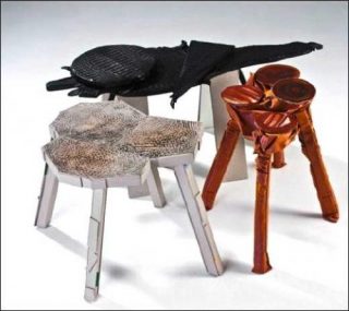 — Collection de tables basses Bichos, 2009. Bois, cuir, agate, papier, tripe de bœuf, soie.