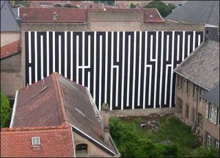 Le mur du Frac Lorraine n’est pas peint, il s’agit d’une bâche géante de trente mètres sur quinze qui recouvre un mur pignon. L’impression est digitale et l’installation est permanente. Howcanyousleep est une injonction adressée à un individu. La pièce est visible à partir du centre, il faut monter et accéder à une salle pour pouvoir contempler la phrase.
