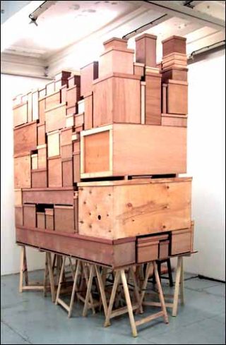 D’abord, une boîte contenant l’atelier de l’artiste, accessible au seul regard à travers un petit trou, éclairé d’une lanterne. Une réplique de l’atelier avec des sculptures de petite taille. Tout est déplacé, diminué, dupliqué, pensé à cette échelle. La maquette devient un champ de travail et d’expérimentation. Puis un ordinateur, sur lequel on peut consulter le site de l’artiste, offre une autre ouverture sur son atelier et ses recherches plastiques. Scruter et consulter. En navigant, on découvre des fichiers virtuels: des vues et des références d’œuvres. Enfin, tout autour de l’ordinateur — dessus, dessous, derrière, sur les côtés — des boites en bois soigneusement rangées en un immense empilement renferment chacune des sculptures, des objets: des œuvres. On accède à ces œuvres directement en ouvrant les boites une à une, ou à partir des références délivrées par le site internet. Du contenant au contenu, ou de l’image à la chose: le passage s’ouvre sur l’imaginaire…