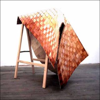 — Mouton, 2001. Sculpture mince, bois contreplaqué, ficelle, tréteau. 40 x 110 x 1cm.