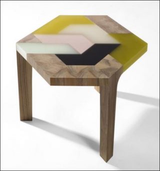 Le plateau repose sur trois piètements triangulaires, exécutés en bois de noyer, dont la simplicité formelle met en valeur le chromatisme et la modernité du plateau.