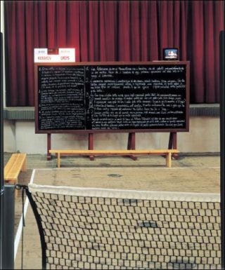 La partie a été jouée par Ilya Kabakov et Boris Groys. Les spectateurs peuvent observer l’action passée sur des moniteurs télé. Certes, les joueurs n’ont pas le niveau de Boris Becker ou de Marat Safin, mais le principal, après tout, est d’aimer le jeu. En même temps, les spectateurs peuvent contempler le résultat d’un autre jeu, écrit sur les tableaux noirs. Les dialogues entre le philosophe Boris Groys et l’artiste Ilya Kabakov sont présentés comme cinq rounds d’un match de tennis dans lequel une question est servie puis suivie par un coup réciproque.