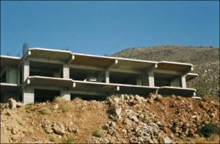 Des ouvertures dans le bâtiment laissent parfois entrevoir au spectateur le paysage azuré par delà cette barrière visuelle (Château en Espagne, Crète 2004 ou Iles des Cyclades, 2009) et, par ricochet, l’envers du décor né de revirements économiques; si bien que tout édénique qu’il soit, le paysage n’apparaît jamais comme tel dans l’image. Dépourvues de leur fonction, ces structures vides sont autant de sculptures flanquées dans un paysage où les ravages économiques mettent à mal tout grandiose.