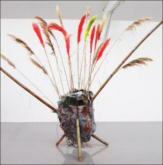 Ses sculptures — colorées, ornées, composites — rassemblent des objets hétéroclites ayant eu une vie antérieure comme des objets usuels occidentaux, des objets d’art dit primitif fabriqués en série et des matériaux aussi divers que tissus, bâches, bois récupéré, etc. Jouant sur les surfaces et les volumes, ces éléments ainsi assemblés assument leur aspect décoratif et artisanal. Ses sources et ses références sont variées mais soigneusement choisies, des primitivismes africain, précolombien, océanien aux cultures populaires, urbaines, «street», en passant par la «surf culture», que l’on retrouve également dans la sculpture californienne. Les questions du post-colonialisme mais aussi des «low cultures» sont évoquées sans parti pris, par le prisme d’un exotisme tout à fait personnel.