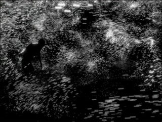 Dans sa vidéo au format panoramique, Hugo Arcier, usant de points blancs sur fond noir, montre «en creux» la progression d’un homme, la nuit, pendant une tempête de neige. L’Affaiblissement progressif des ressources dure le temps d’une traversée unique, de gauche à droite, où arpenter un territoire n’est plus le mesurer, mais revient à l’éprouver physiquement, à l’épuiser.