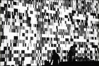 Test pattern est un programme informatique qui convertit en temps réel les signaux, qu’ils soient sonores, comme c’est le cas ici, textuels, ou visuels, en images de codes barres ou de données informatiques binaires constituées de 0 et 1. L’installation est composée d’images projetées sur une surface au sol de 12m x 3 m accompagnée par un dispositif sonore.