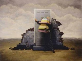 On pense à Magritte, dont on reconnaît la veine surréaliste, le goût du mystère et de l’absurde, mais aussi aux peintres flamands du XVIIe siècle. Même paysages lumineux, à la végétation rare, aux ciels bas et à l’horizon dégagé, qui ne sont pourtant que des décors en carton-pâte fabriqués de la main de l’artiste et photographiés en noir et blanc. Tirés en Sépia, les clichés sont ensuite rehaussés à l’huile, gagnant en couleurs et en poésie.