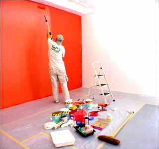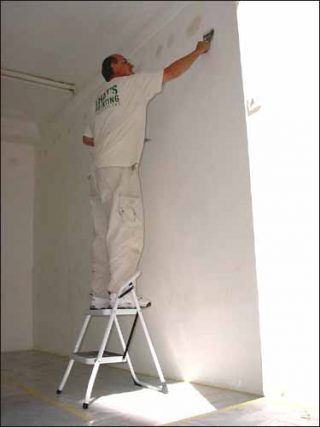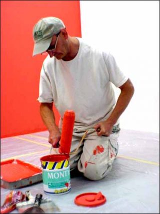 — Rebouchage des 250 trous de l’exposition précédente (Neal Beggs), préparation des murs et peinture en rouge brique (Tollens 303).