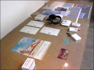 Au centre de l’espace, deux grandes tables invitent le spectateur à s’asseoir pour prendre connaissance des documents en consultation, à feuilleter les classeurs, à visionner un DVD ou écouter un CD.