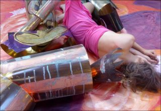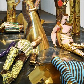 L’installation Pink Everywhere réunit plusieurs de ces personnages métalliques à taille humaine dans ce qui ressemble à une danse ou une procession où des créatures debout esquissent des mouvements festifs tandis que d’autres gisent à leurs pieds, couchés ou assis, comme assommés par d’excessives réjouissances. Dans la sculpture Cream Sacrifice, un personnage est fixé à une structure pointue et semble agité de mouvements désespérés pour s’en délivrer.