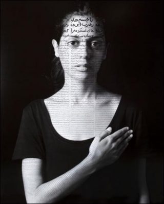À nouveau dans cette série, Shirin Neshat utilise la calligraphie comme un moyen d’emphaser la valeur métaphorique de ses portraits. Tout en venant obscurcir ou à l’inverse illuminer les expressions faciales des sujets et leur intensité émotive, les fines écritures et dessins à l’encre créent un lien intime entre l’énergie actuelle de l’Iran contemporain (celle que figurent les sujets de ces portraits) et son passé mythique et historique (tel qu’il figure dans le Shahnameh).