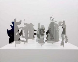 — Peter Coffin, Untitled (Sculpture Silhouette), 2010. 39 Silhouettes de Sculptures en métal poli, socle. 120 x 121 x 213 cm